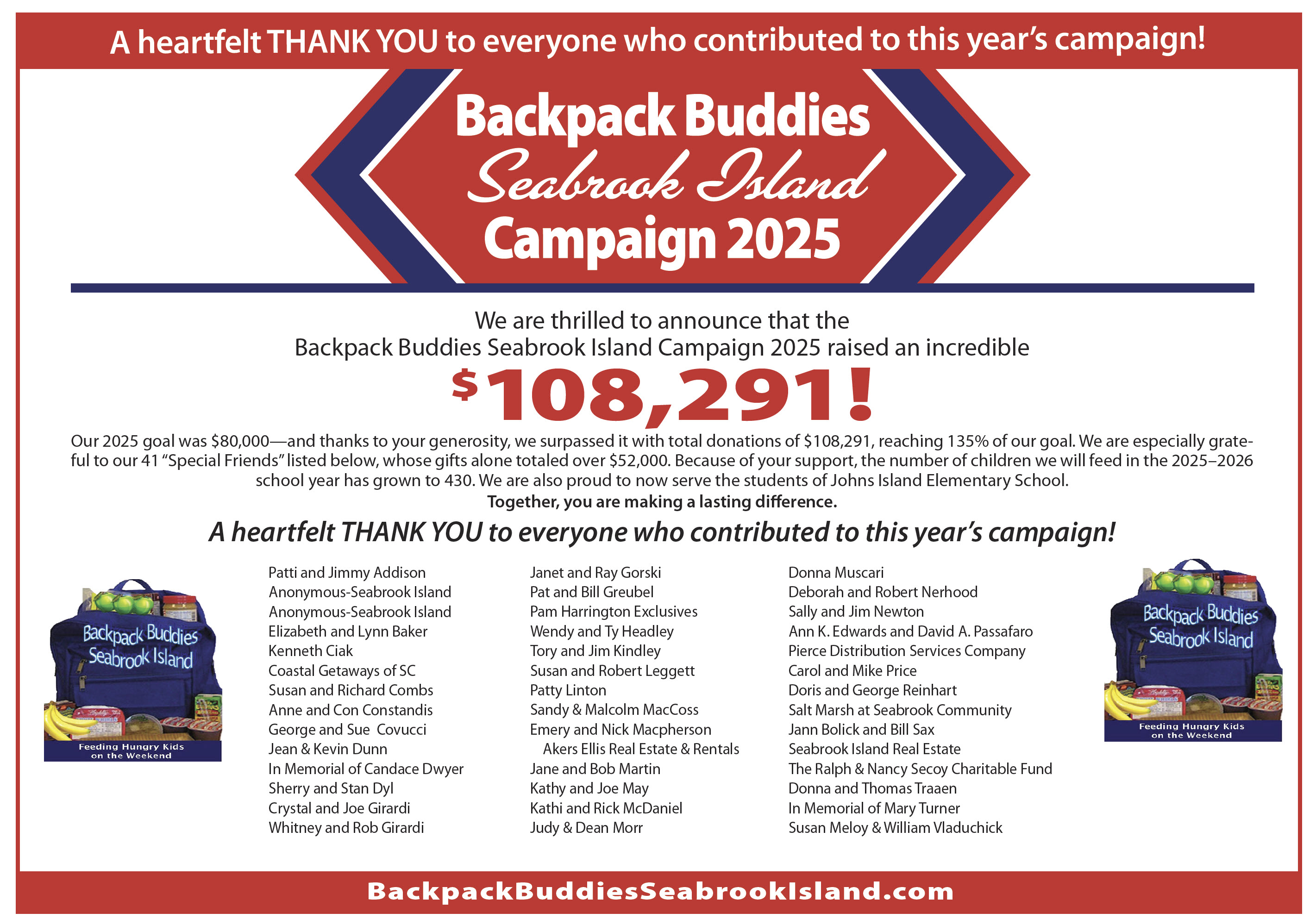 Thank you to each and every donation made to the Challenge this year! Thank you to all the friends that matched every donation! Backpack Buddies Seabrook Island will be able to provide much needed nutrition to children in need. We raised $108,291 for this year.